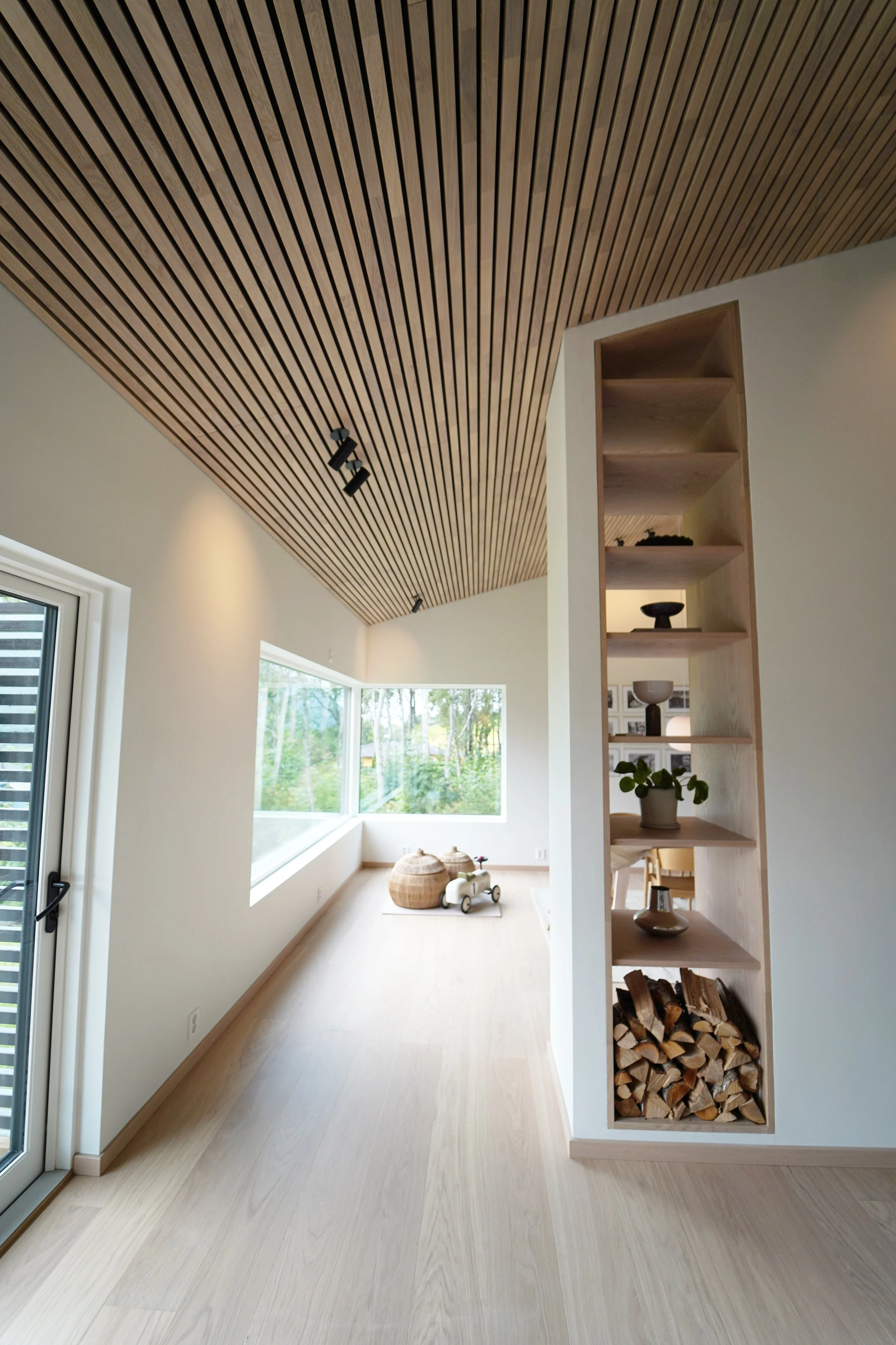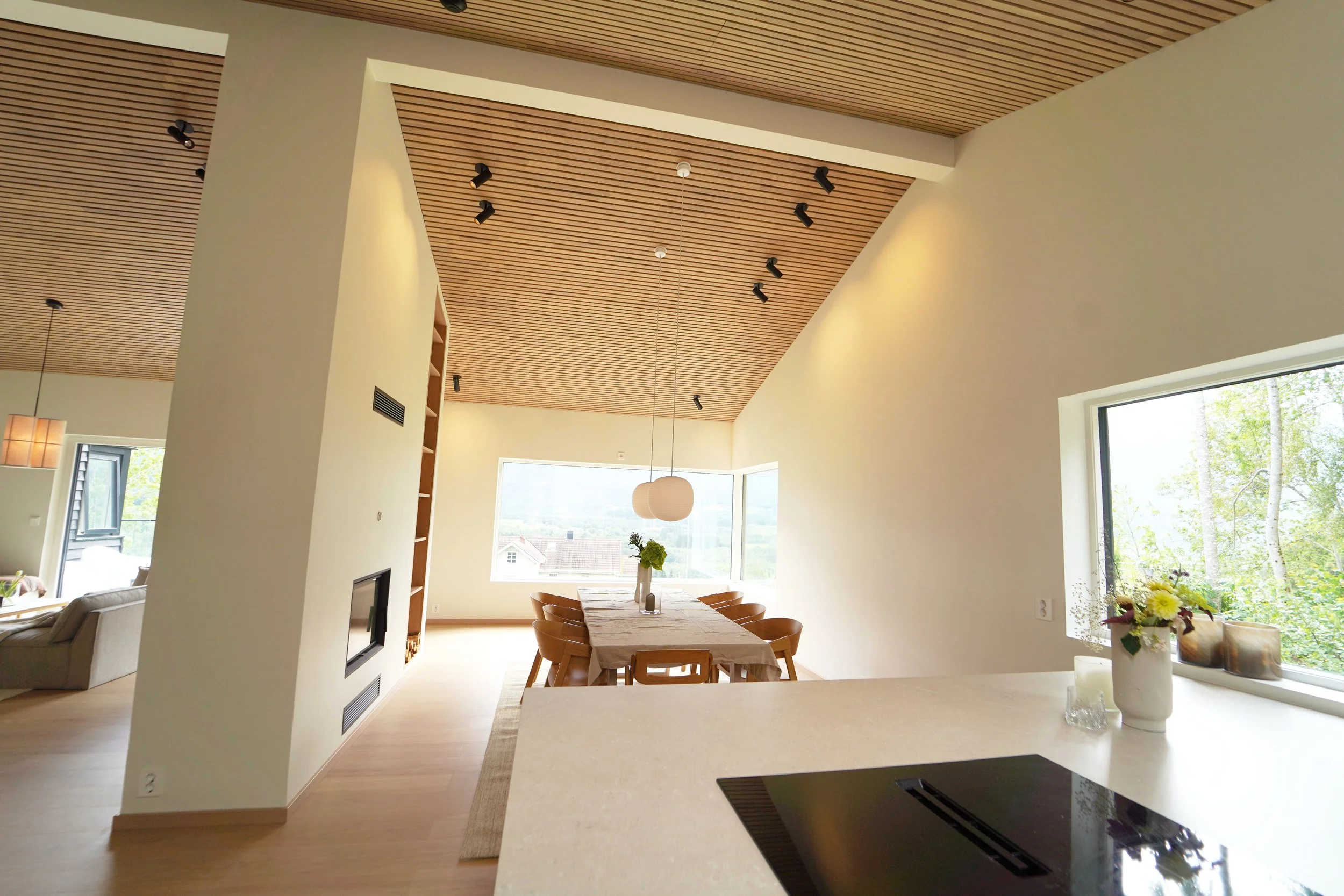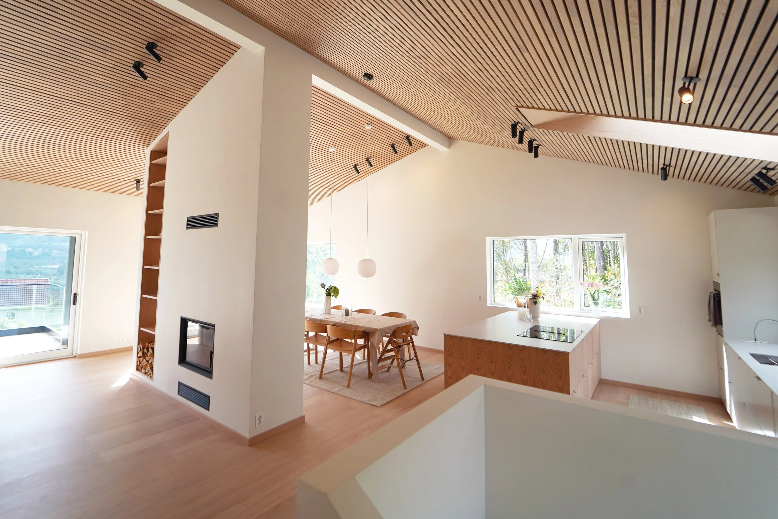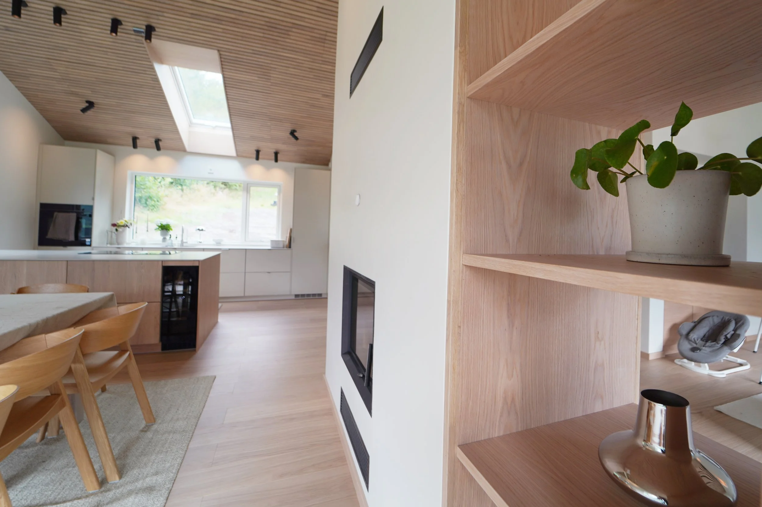 Fellesarealet i inngangsetasjen er delt inn to soner ved hjelp av skillevegg som inneholder peisovn og hyller, i tillegg til at den er bærende for takkonstruksjonen.