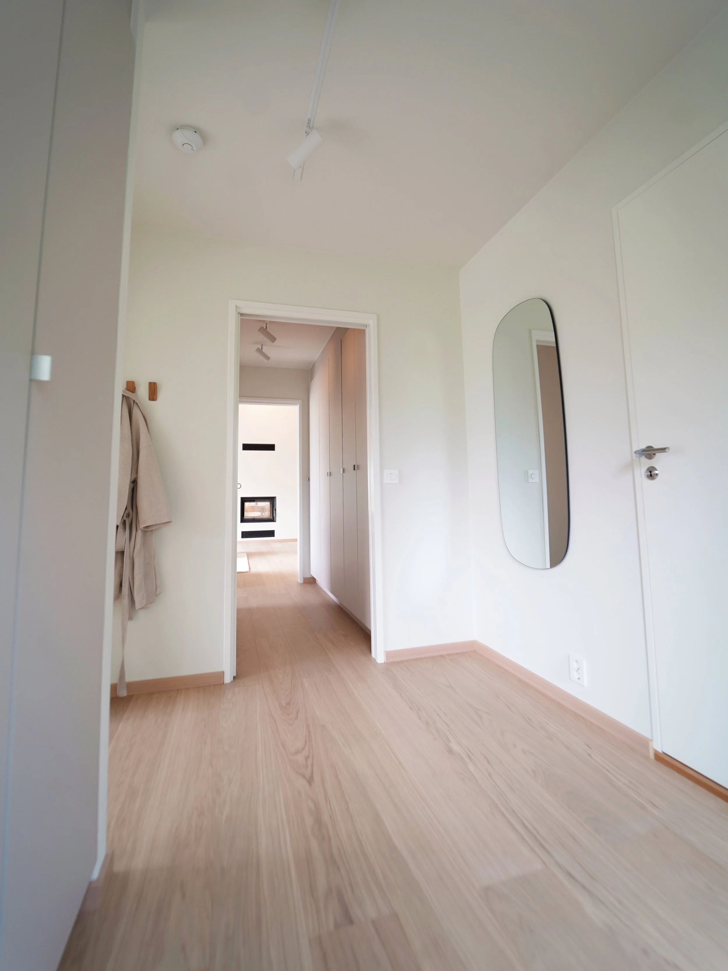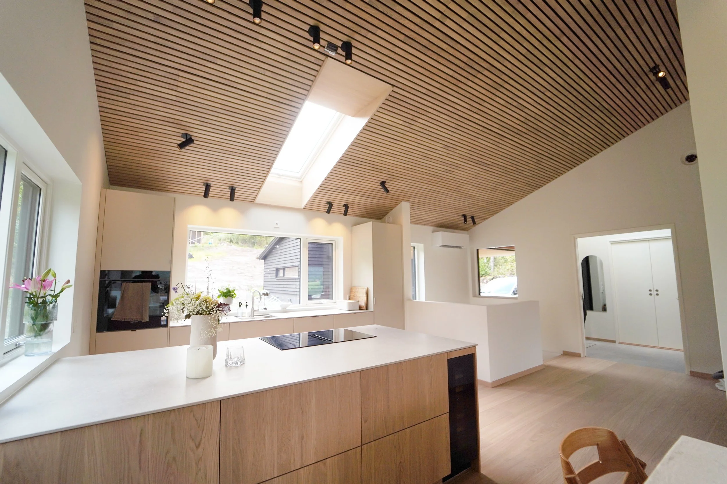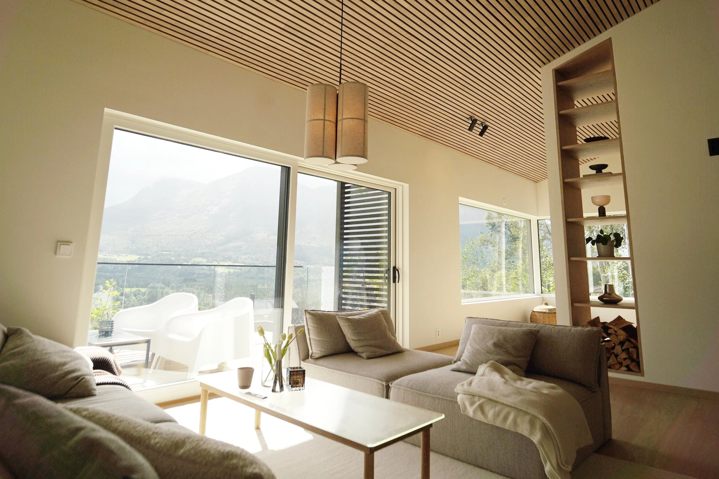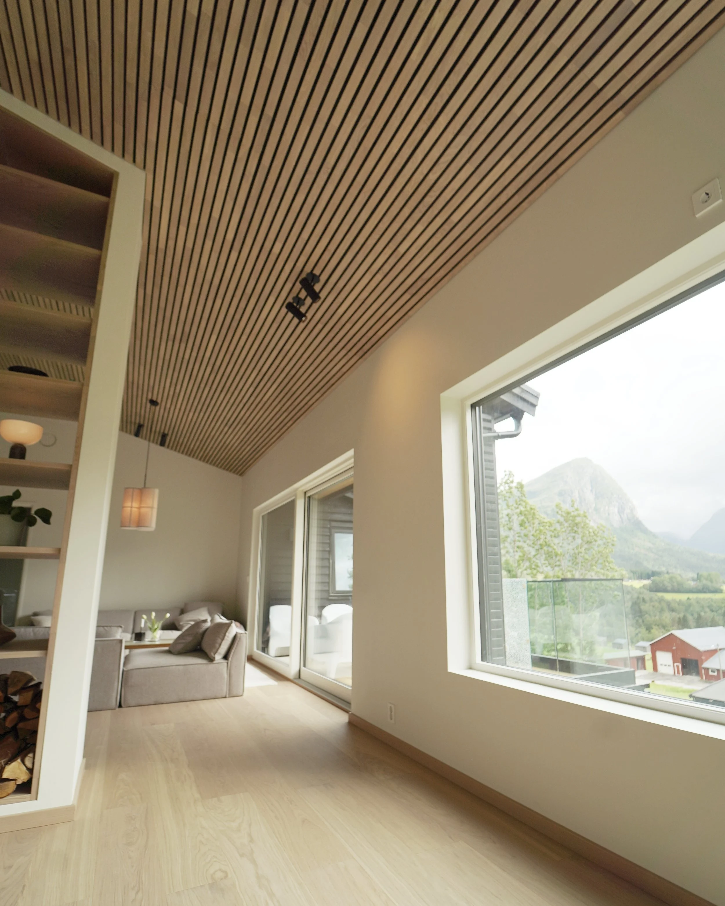 Fellesarealet i inngangsetasjen er delt inn to soner ved hjelp av skillevegg som inneholder peisovn og hyller, i tillegg til at den er bærende for takkonstruksjonen.