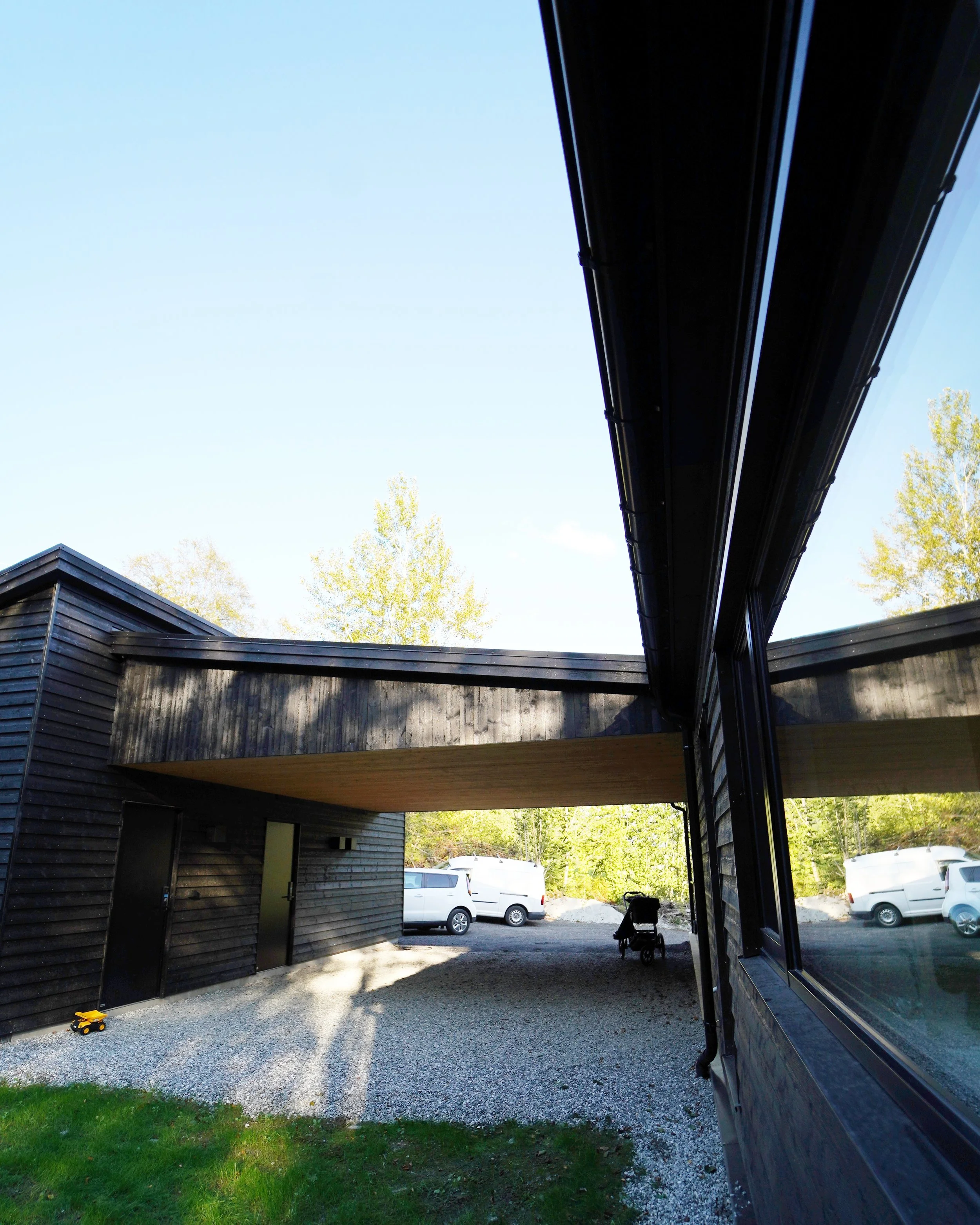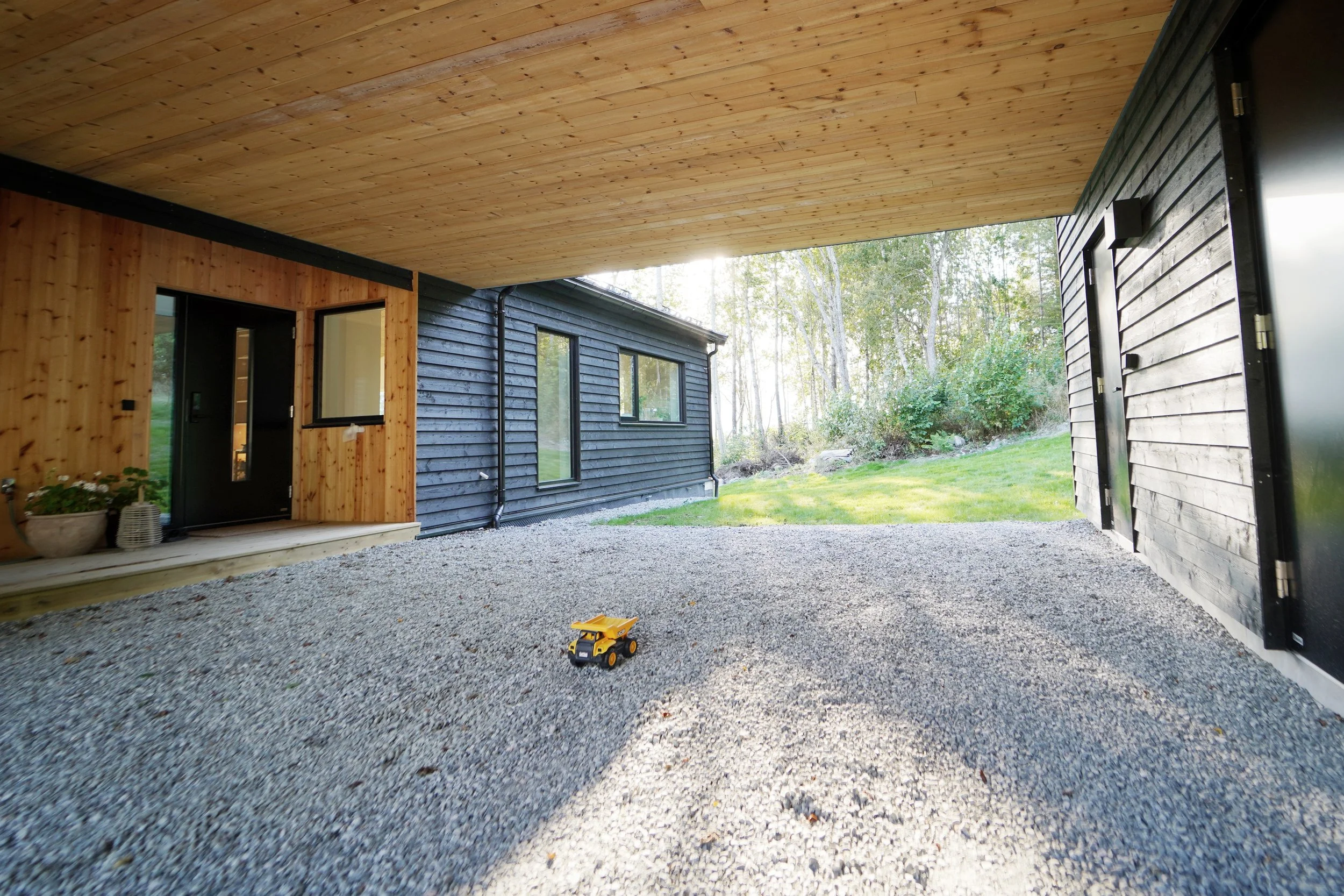 For å kunne gå tørskodd fra garasjen til inngangsdøra, ble garasjen knyttet sammen med boligen med overbygg/carport.