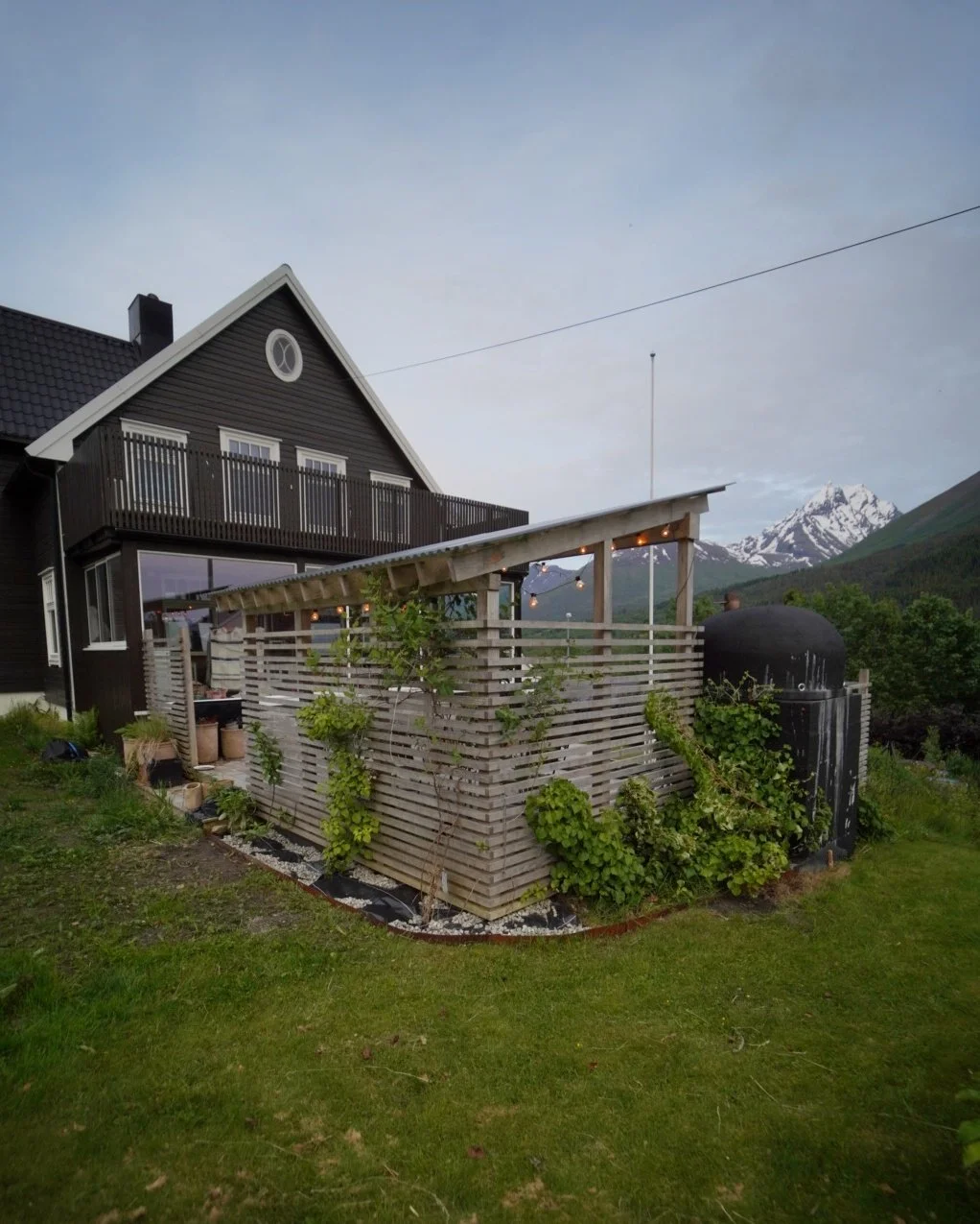 Oppgaven her var å forme en skjermet uteplass, og å gjøre adgangen fra hus til hage enklere. For at anlegget i størst mulig grad skulle være en del av hagen, kun med gjerde/vegg der det var behov for skjerming, ble trappene planlagt på en måte som minimerte områder med fallfare, og dermed krav om rekkverk.