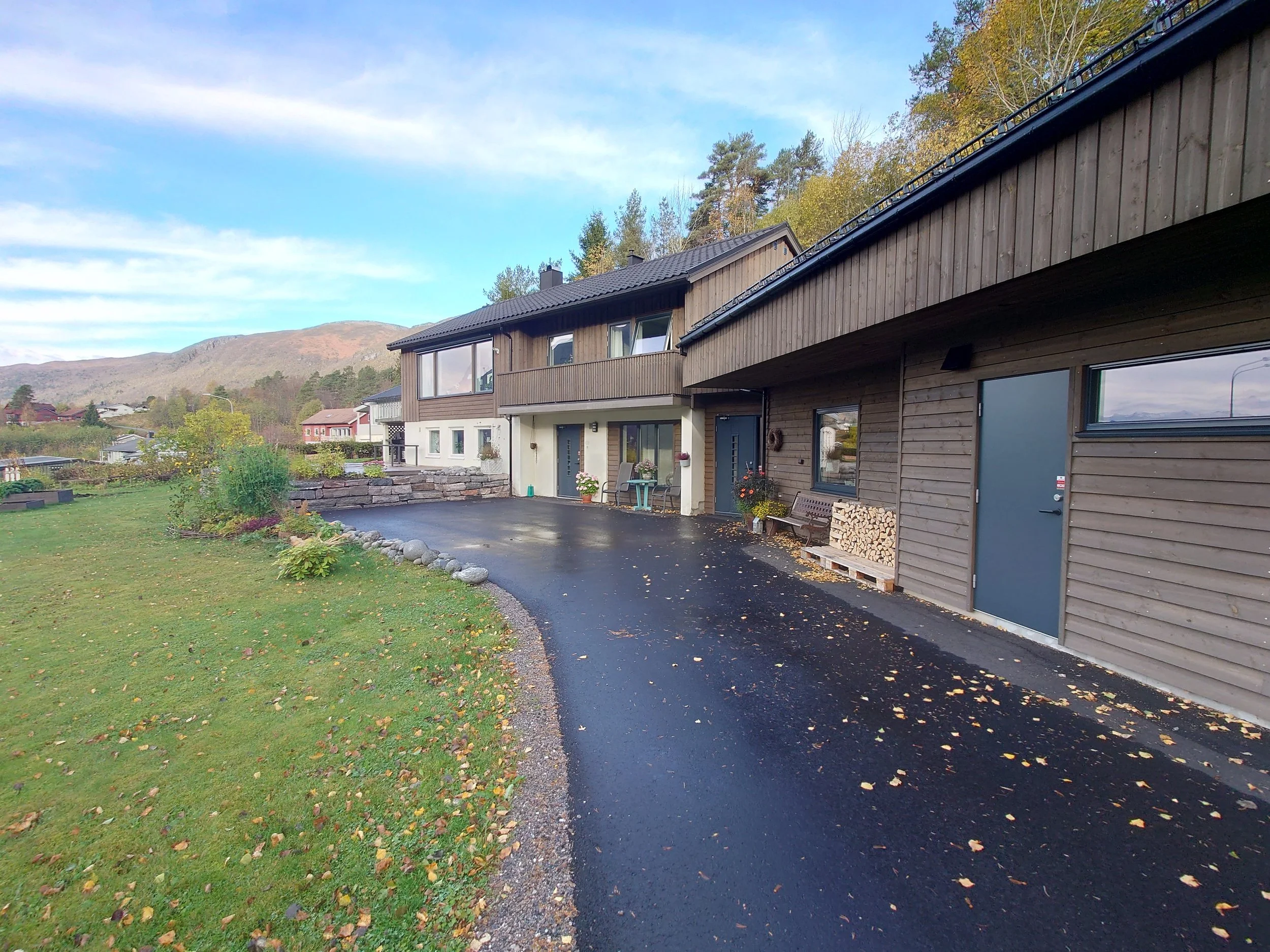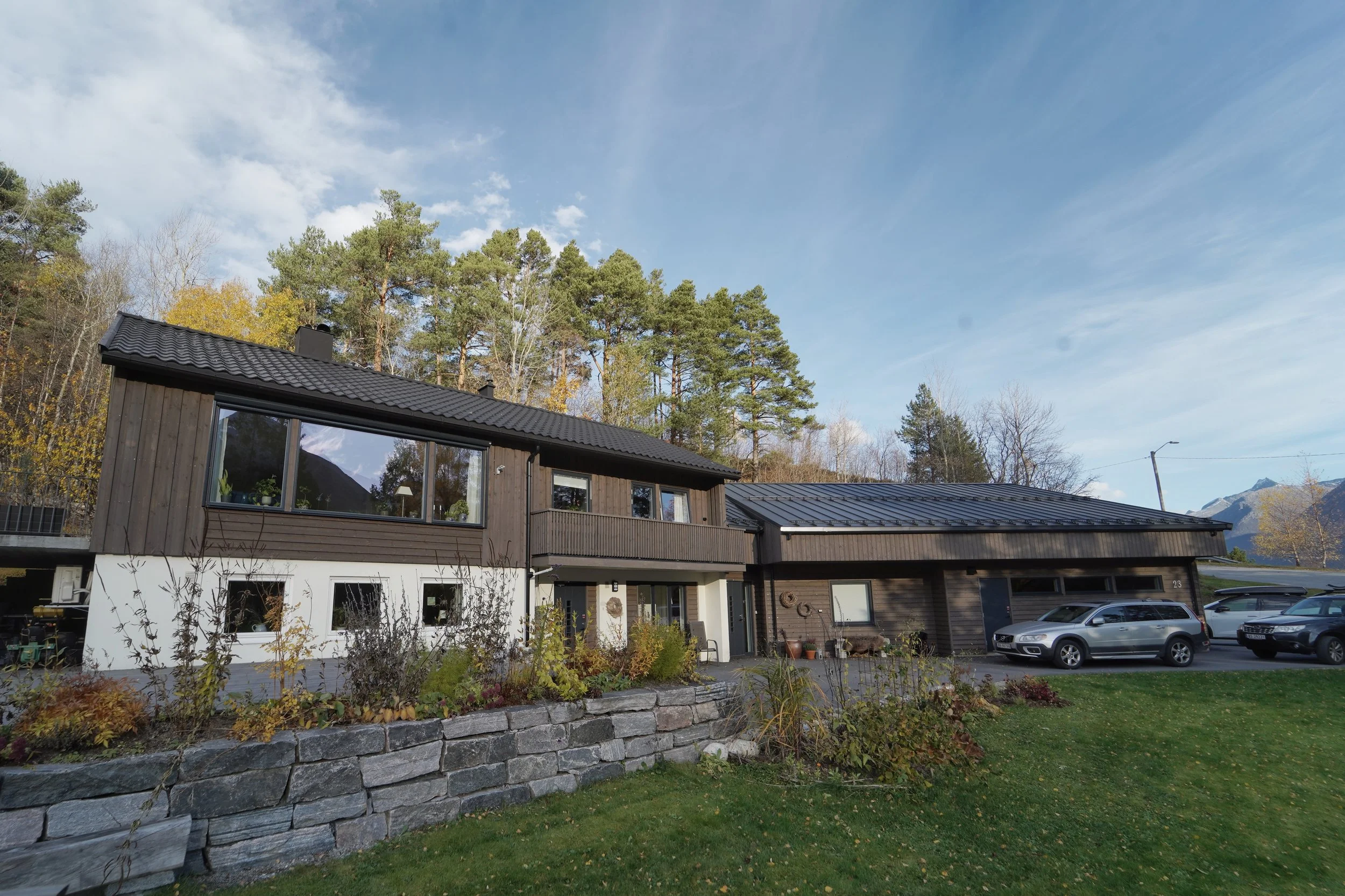 Ønskene her var ny dobbeltgarasje, verksted, flere soverom og en åpnere og bedre inngangssituasjon. Her jobbet jeg med å gjøre tilbygget godt tilpasset og underordnet eksisterende hus, og minst mulig dominerende på tomta, til tross for relativt stor grunnflate.