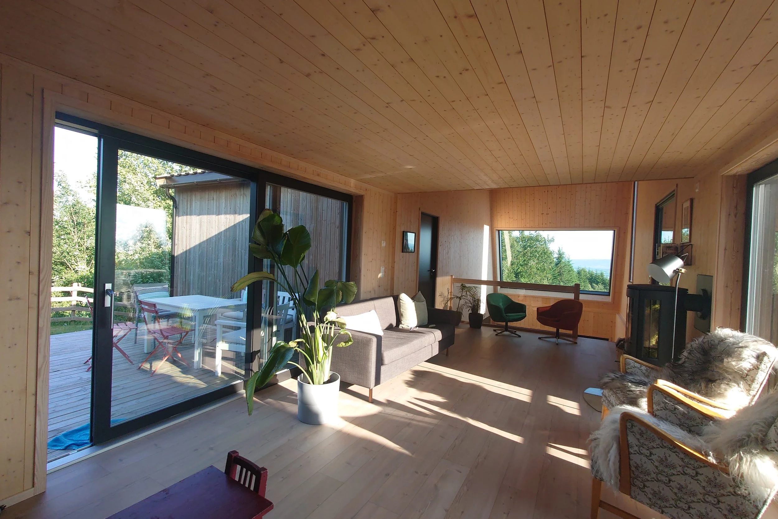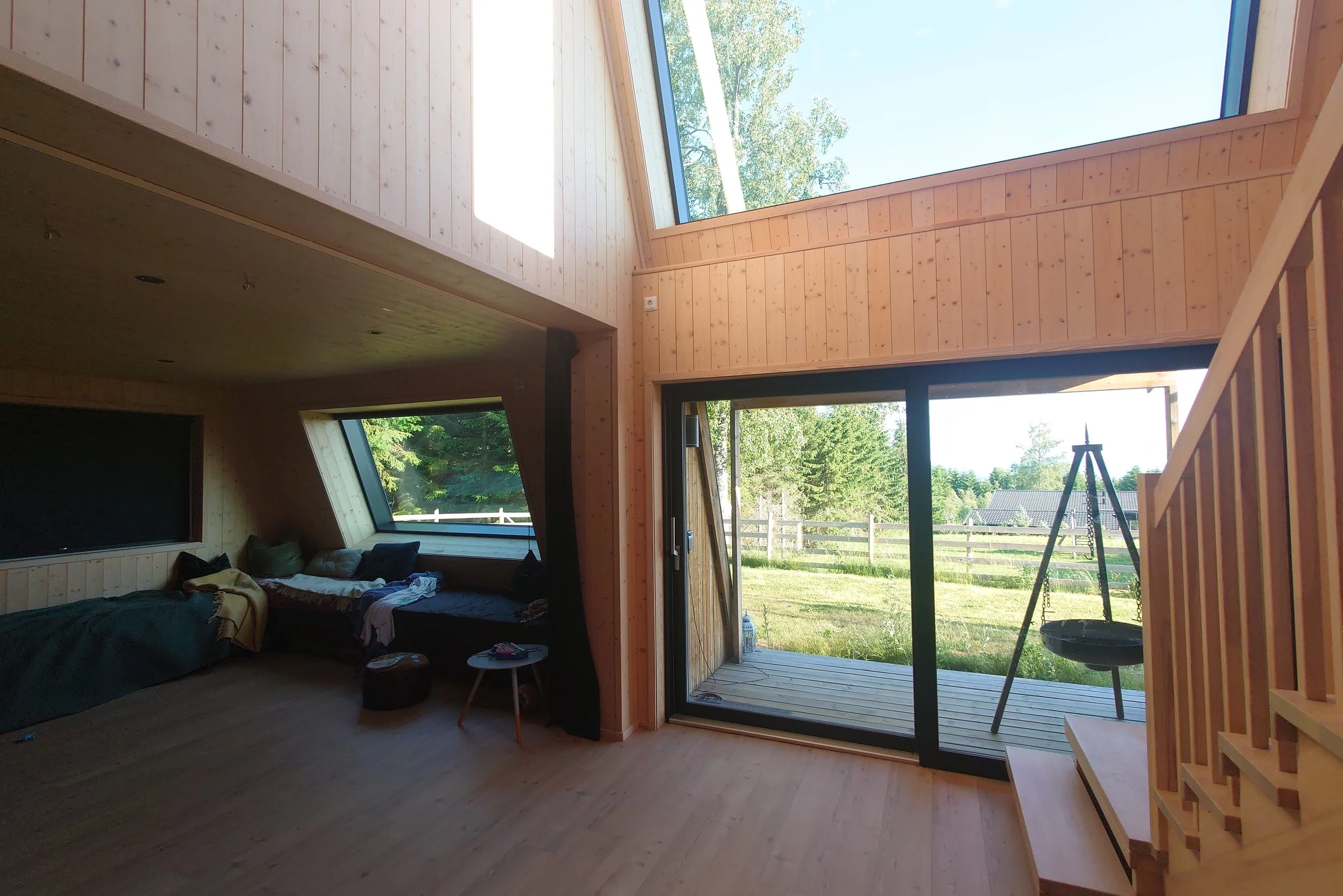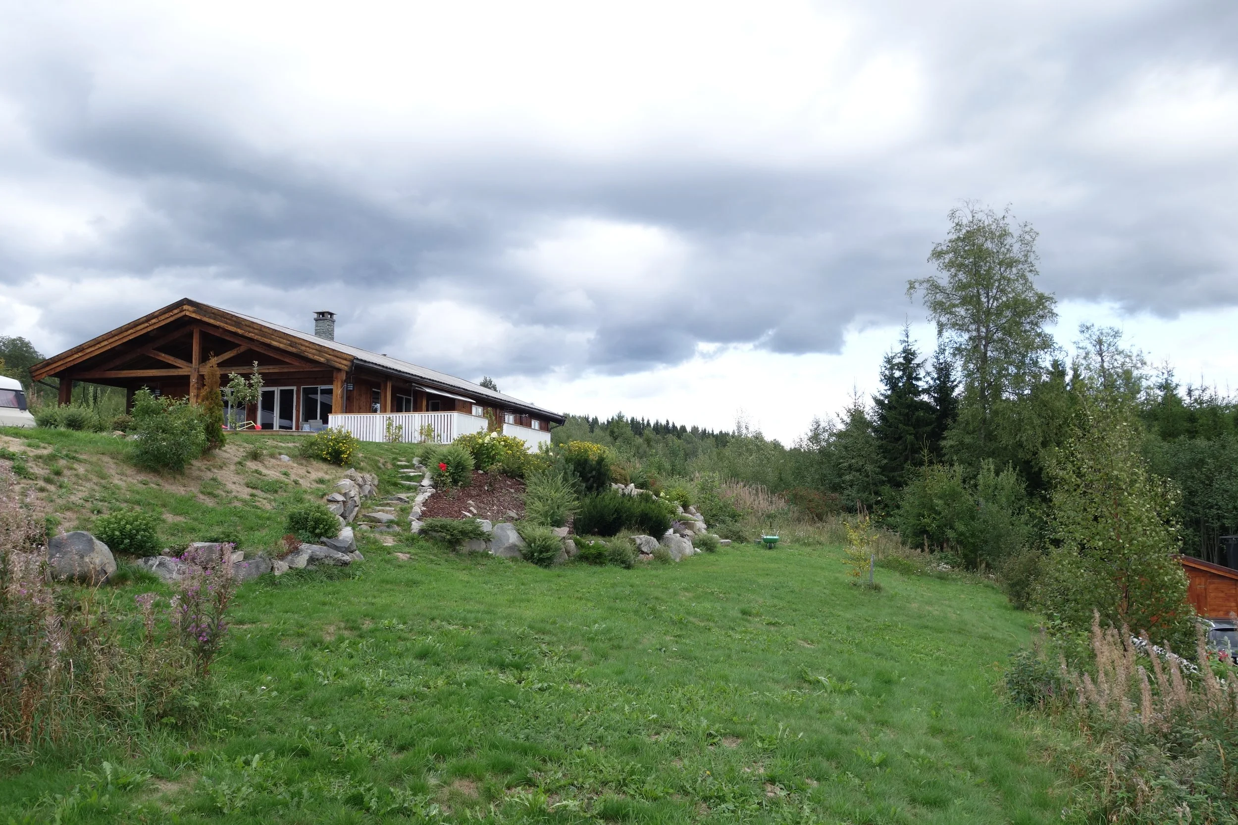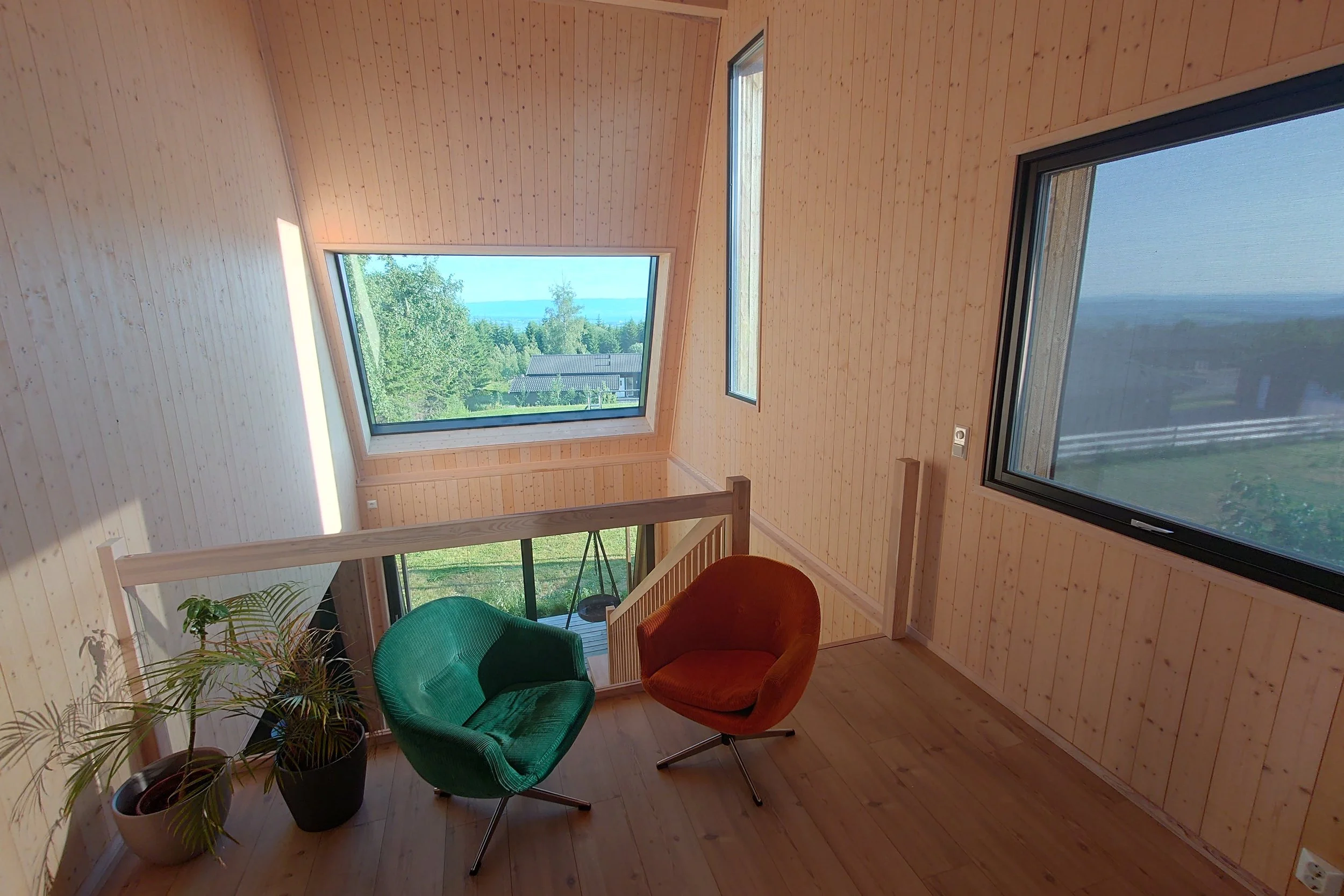Den opprinnelige eneboligen, lokalisert på Ingeberg i Hamar kommune, ligger på øvre del av en tomt delt i to ulike nivåer, med ca. 2,5 m høydeforskjell. Kundene ønsket seg flere soverom, mer stueareal, treningsrom og ekstra bad. Jeg foreslo da å bruke tilbygget til å gi huset bedre kontakt med tomtas nedre nivå. For å få det to-etasjers tilbygget best mulig tilpasset terrenget, og ikke bli for ruvende i omgivelsene, er den høyeste veggen vinklet.